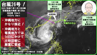 スポンサーリンク 【速報 『2025年 台風第26号! ①気象庁は、11月13日、沖縄地方にかなり接近すると予想! ②沖縄地方・奄美地方では、14日にかけて、土砂災害に厳重に警戒と呼びかけている!』】 #台風第26号 2025/11/14 台風情報 スポンサーリンク 出典:気象庁HPの台風情報など:2025(令和7)年11月13日6時時点 【注目ポイント】 1 台風第26号!:11月13日6時 与那国島 …