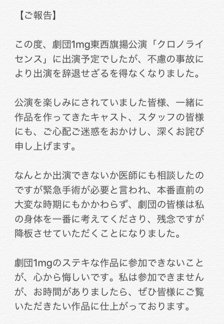 この度、不慮の事故で入院・手術を余儀なくされ、出演予定でした劇団1mg東西旗揚げ公演「クロノライセンス」を降板せざるを得なくなりました。皆様にはご心配、ご迷惑をおかけし大変申し訳ございません。