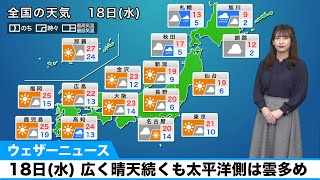 スポンサーリンク 18日(水)の天気/関東以西は晴天続く。北海道は天気下り坂 2020/11/18 天気 スポンサーリンク 関東以西は高気圧圏内で晴天が続きます。気温は高く、九州を中心に季節外れの陽気となる見込みです。 北海道は低気圧や前線の通過に伴い天気が崩れ、雨や雪の範囲 … 関連ツイート