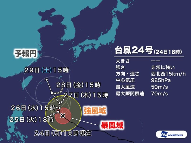 【台風情報】24日(月)18時現在、非常に強い勢力の台風24号(チャーミー)は、引き続きフィリピンの東を西北西に進んでいます。今週中頃に猛烈な勢力で沖縄の南に達し、週末には沖縄の先島諸島へ接近。その後は、各予想モデルの多くが本州へ進む傾向を示し始めています。