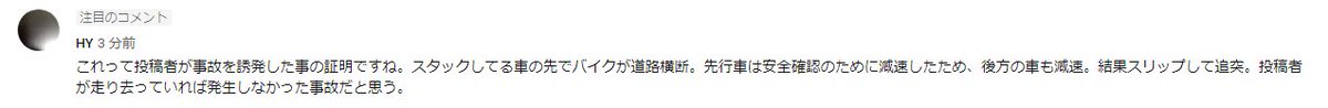 これって投稿者が事故を誘発した事の証明ですね。スタックしてる車の先でバイクが道路横断。先行車は安全確認のために減速したため、後方の車も減速。結果スリップして追突。投稿者が走り去っていれば発生しなかった事故だと思う。