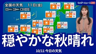 スポンサーリンク 10月11日(金)の天気予報 広く穏やかな秋晴れ 北陸や北日本太平洋側は雨の可能性あり 2024/10/12 天気 スポンサーリンク 11日(金)は移動性高気圧に覆われて広い範囲で穏やかな秋晴れとなります。一方、北陸や北日本太平洋側では時々雨が降って傘の …