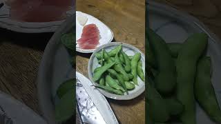 今日の晩酌 明太イワシ、枝豆、キハダマグロ